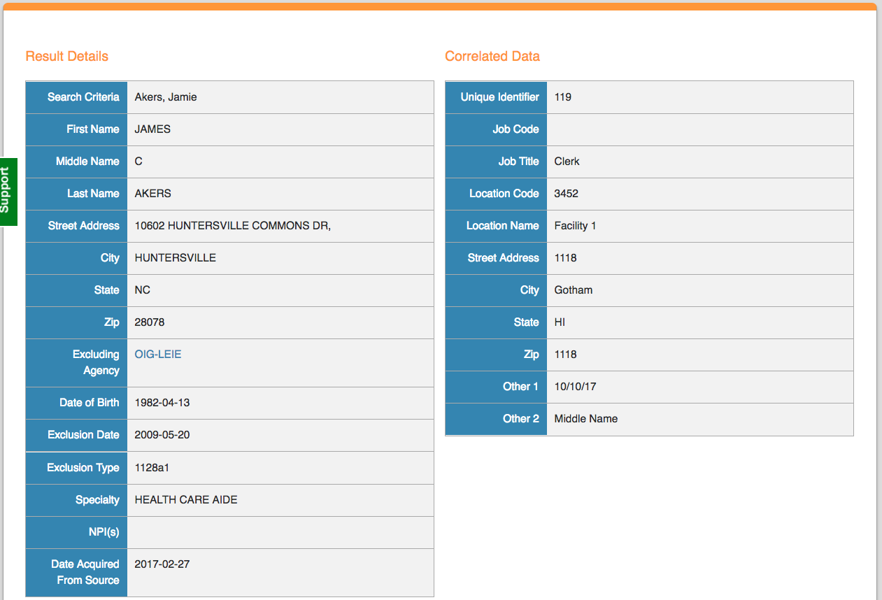 The Long Form and SSNDMF template also allow you to input correlated data. While correlated data is not searched against exclusion information it will appear alongside source provided information when reviewing a record that may help in a determination.
