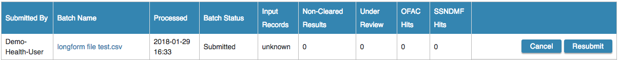 The file will then appear in the table on the Name Batch Search Page in a submitted status. The status will change to "Processing" once it begins searching. This can take a few seconds to minutes depending on the file size. Once it's finished we'll send you an email to let you know and the status will change to "Processing Complete". You can then review your results.