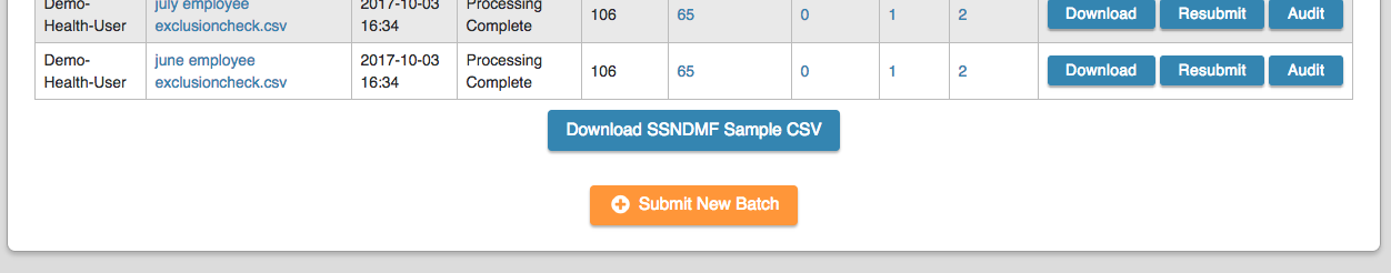Once you've input all necessary information into your file you're ready to upload it in ExclusionCheck. At the top of the "Batch Name Search" page you'll click "Submit New Batch".