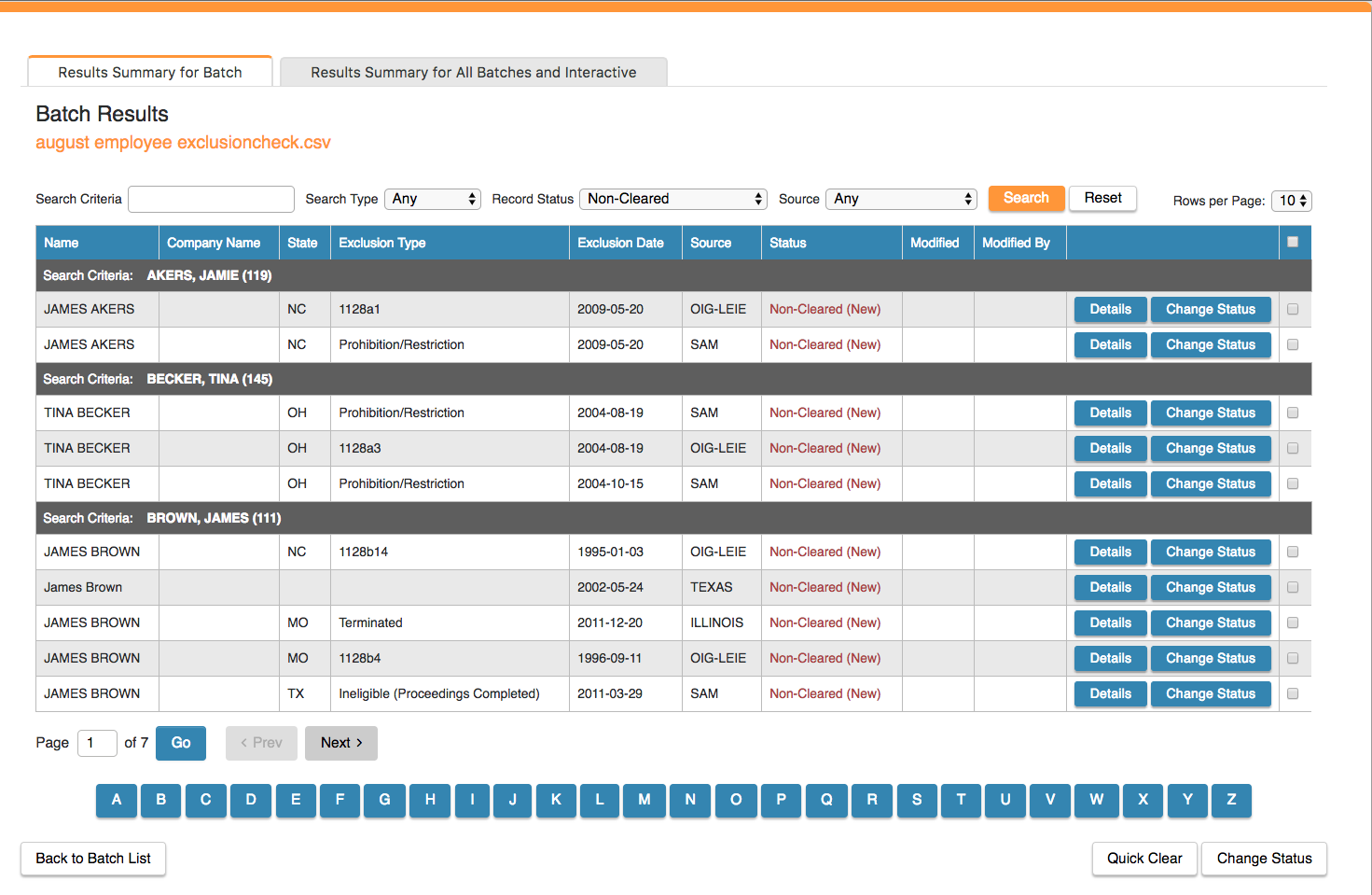 Selecting a number will display the associated records for the batch and column selected. If reviewing "Non-Cleared", "Under Review" or "OFAC" you'll be taken to a page like the below.