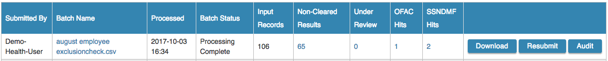 Once a batch has finished running you can review the results. On the batch row we'll display the number of records returned in a Non-Cleared or Under Review status. If you have OFAC searching we'll also display the number of OFAC records returned. (These will also be included in your overall records.) If you have SSNDMF searching on we'll display the number of SSNs searched that are a match to an SSN on the Death Master File.