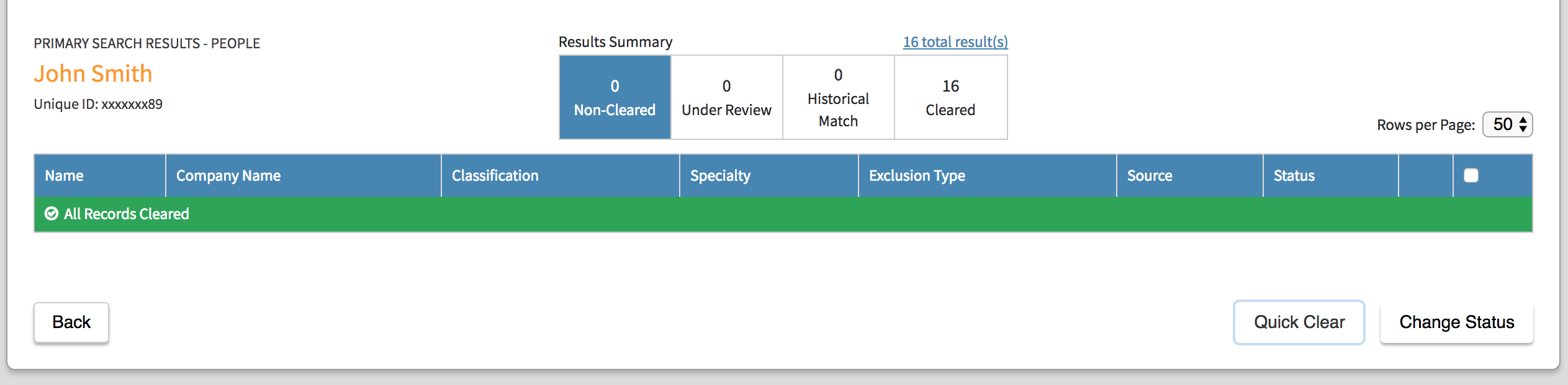 At the top and center of the page we provide a "Results Summary" which displays how many total records match your search criteria and the number that are in each status. The view will default to Non-Cleared records, but clicking in each of the corresponding status boxes will display each of the records in that status tied to the search criteria. If you have previously searched for this person or company, you will see any results you have put in Under Review, "Historical Match," or "Cleared" Status.