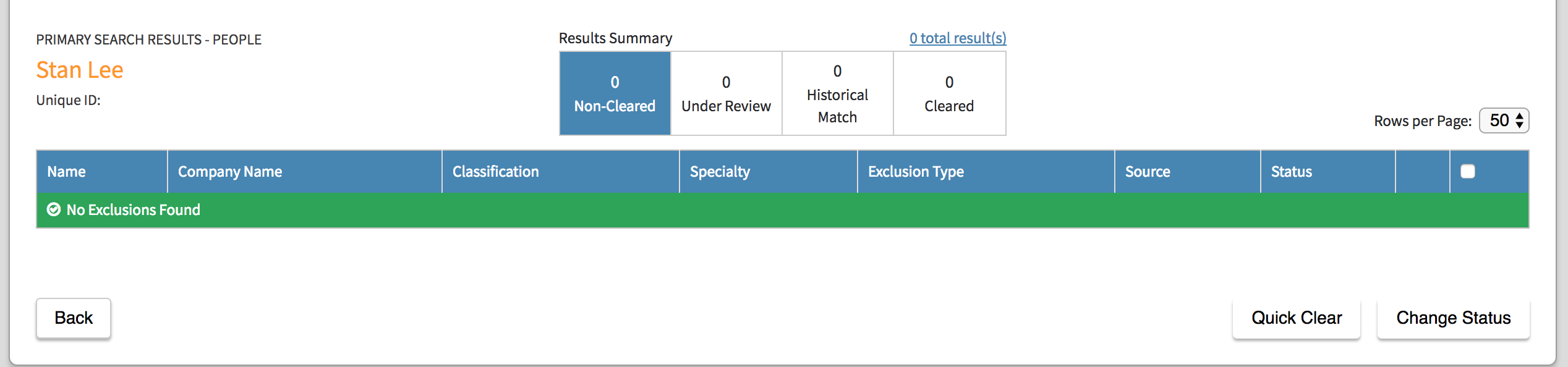 If there are no potential matches, you will see a green banner displaying "No Exclusions Found."